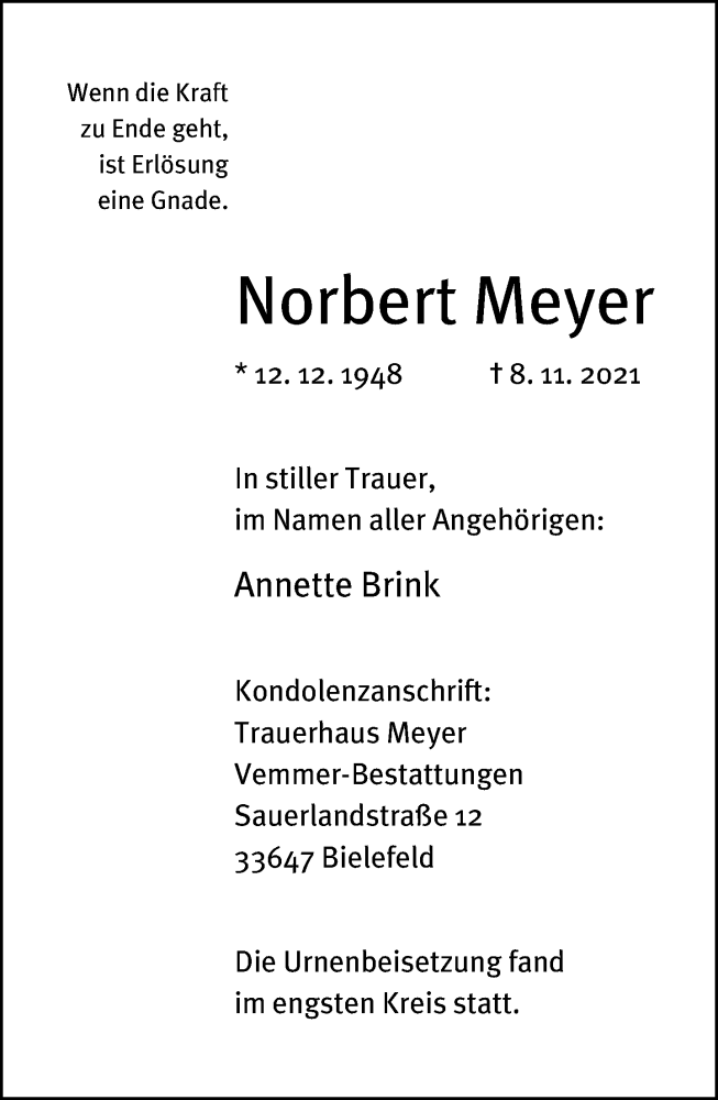 Hier finden Sie alle Traueranzeigen aus der Zeitung, die bisher für Norbert Meyer erschienen sind. Weitere Traueranzeigen, die in der Zeitung erscheinen, werden hier ebenfalls aufgelistet