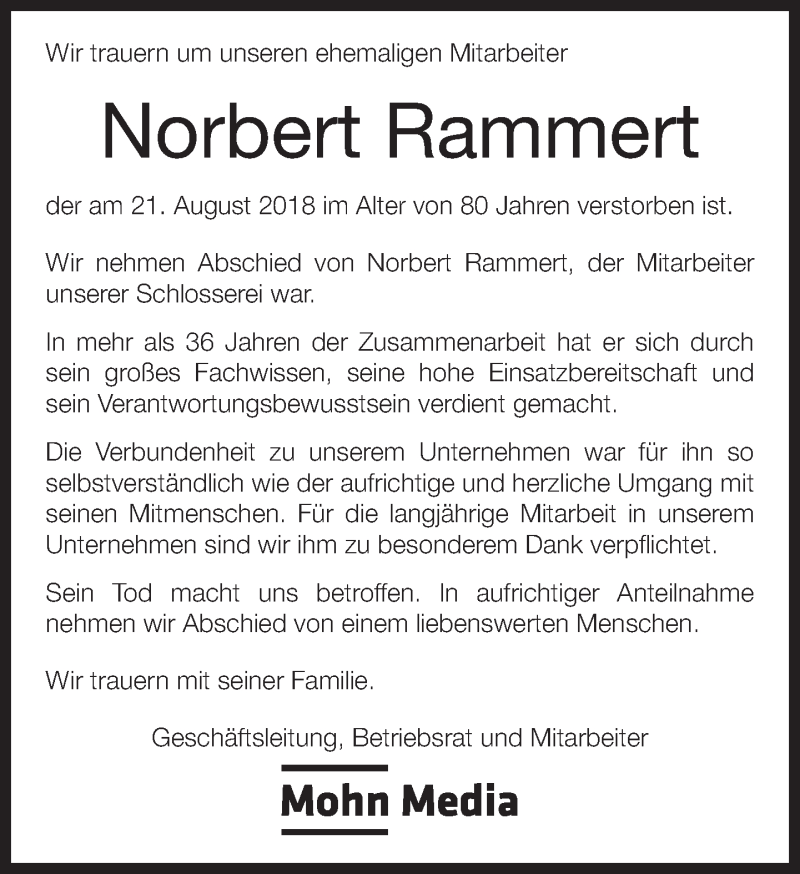 Hier finden Sie alle Traueranzeigen aus der Zeitung, die bisher für Norbert Rammert erschienen sind. Weitere Traueranzeigen, die in der Zeitung erscheinen, werden hier ebenfalls aufgelistet