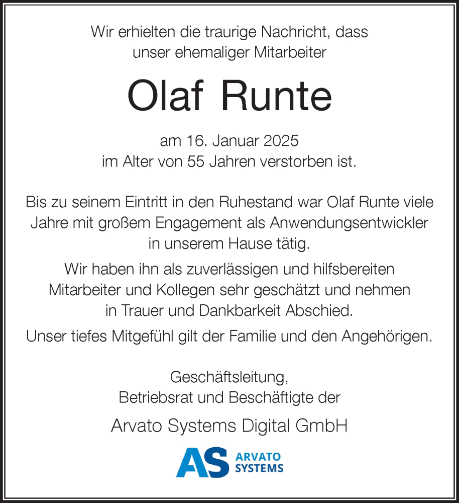 Hier finden Sie alle Traueranzeigen aus der Zeitung, die bisher für Olaf Runte erschienen sind. Weitere Traueranzeigen, die in der Zeitung erscheinen, werden hier ebenfalls aufgelistet