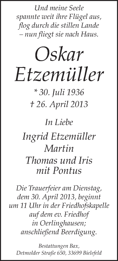 Hier finden Sie alle Traueranzeigen aus der Zeitung, die bisher für Oskar Etzemüller erschienen sind. Weitere Traueranzeigen, die in der Zeitung erscheinen, werden hier ebenfalls aufgelistet
