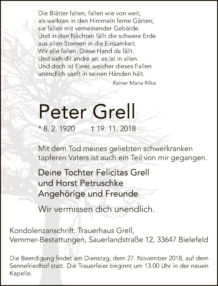 Hier finden Sie alle Traueranzeigen aus der Zeitung, die bisher für Peter Grell erschienen sind. Weitere Traueranzeigen, die in der Zeitung erscheinen, werden hier ebenfalls aufgelistet