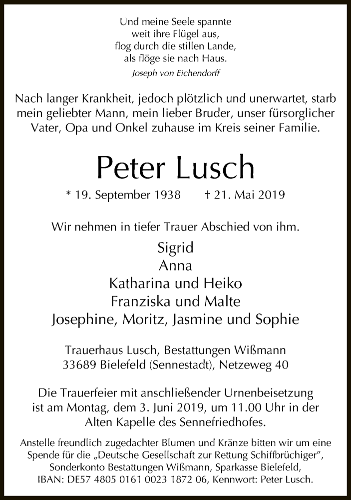 Hier finden Sie alle Traueranzeigen aus der Zeitung, die bisher für Peter Lusch erschienen sind. Weitere Traueranzeigen, die in der Zeitung erscheinen, werden hier ebenfalls aufgelistet