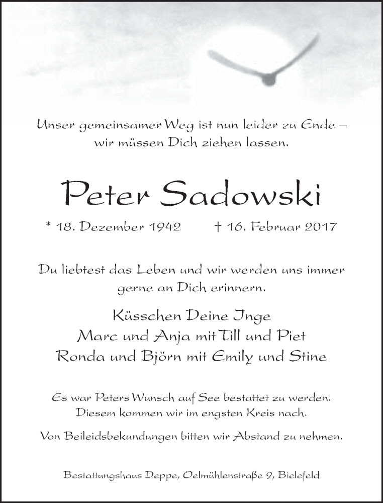 Hier finden Sie alle Traueranzeigen aus der Zeitung, die bisher für Peter Sadowski erschienen sind. Weitere Traueranzeigen, die in der Zeitung erscheinen, werden hier ebenfalls aufgelistet
