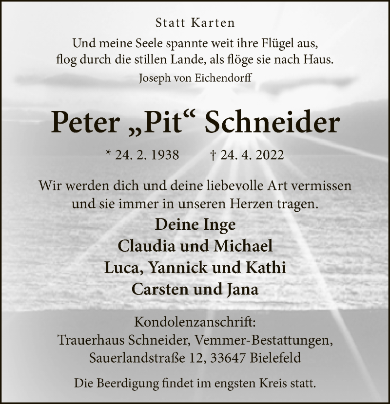 Hier finden Sie alle Traueranzeigen aus der Zeitung, die bisher für Peter Schneider erschienen sind. Weitere Traueranzeigen, die in der Zeitung erscheinen, werden hier ebenfalls aufgelistet