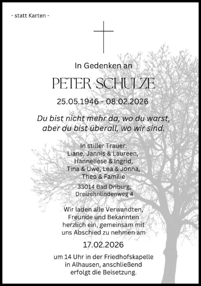 Hier finden Sie alle Traueranzeigen aus der Zeitung, die bisher für Peter Schulze erschienen sind. Weitere Traueranzeigen, die in der Zeitung erscheinen, werden hier ebenfalls aufgelistet