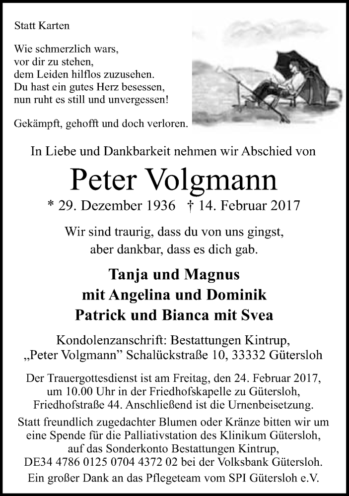 Hier finden Sie alle Traueranzeigen aus der Zeitung, die bisher für Peter Volgmann erschienen sind. Weitere Traueranzeigen, die in der Zeitung erscheinen, werden hier ebenfalls aufgelistet