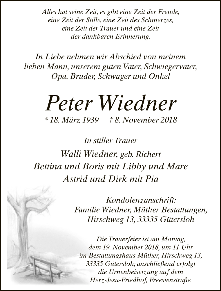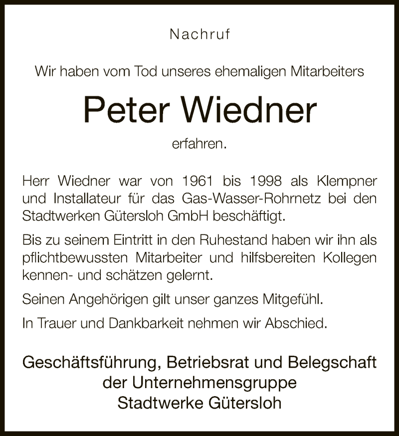 Hier finden Sie alle Traueranzeigen aus der Zeitung, die bisher für Peter Wiedner erschienen sind. Weitere Traueranzeigen, die in der Zeitung erscheinen, werden hier ebenfalls aufgelistet