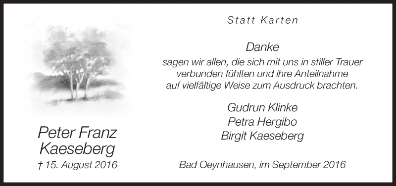Hier finden Sie alle Traueranzeigen aus der Zeitung, die bisher für Peter Franz Kaeseberg erschienen sind. Weitere Traueranzeigen, die in der Zeitung erscheinen, werden hier ebenfalls aufgelistet