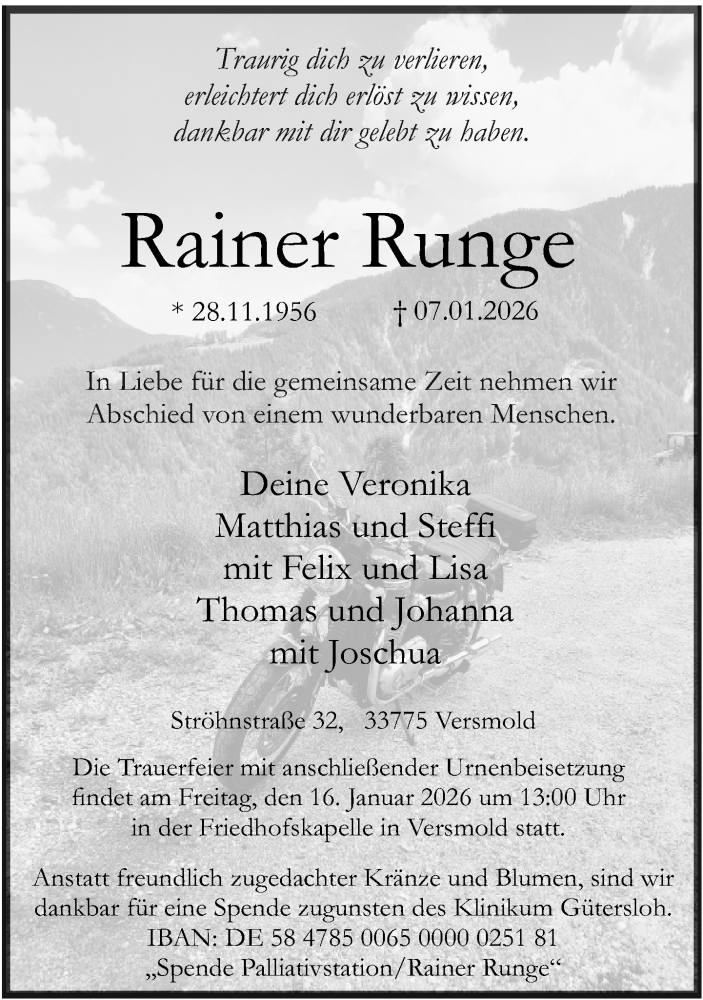 Hier finden Sie alle Traueranzeigen aus der Zeitung, die bisher für Rainer Runge erschienen sind. Weitere Traueranzeigen, die in der Zeitung erscheinen, werden hier ebenfalls aufgelistet
