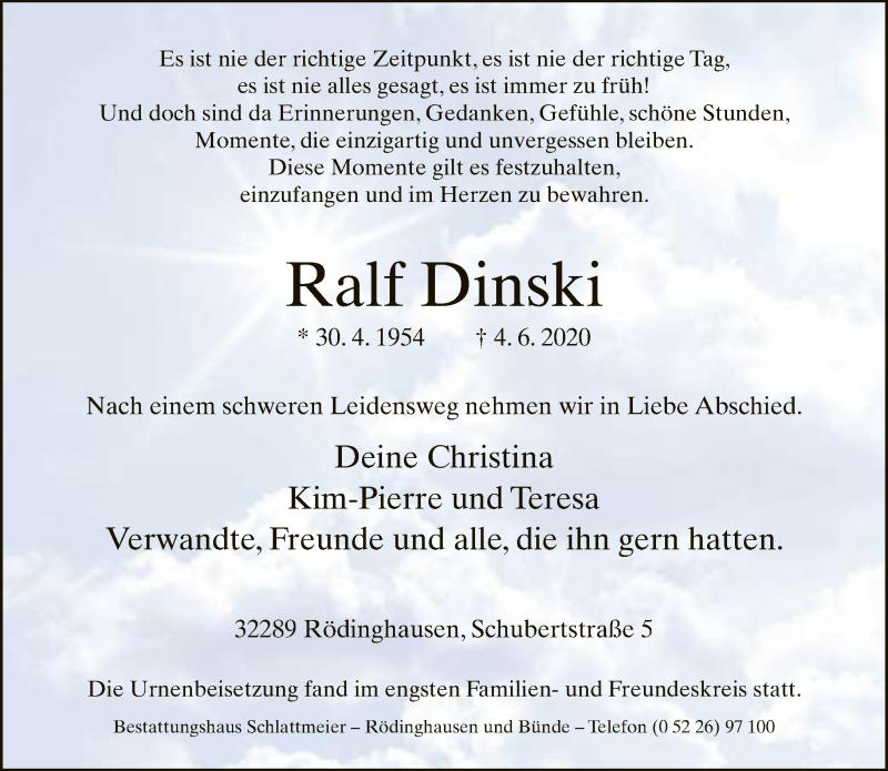 Hier finden Sie alle Traueranzeigen aus der Zeitung, die bisher für Ralf Dinski erschienen sind. Weitere Traueranzeigen, die in der Zeitung erscheinen, werden hier ebenfalls aufgelistet