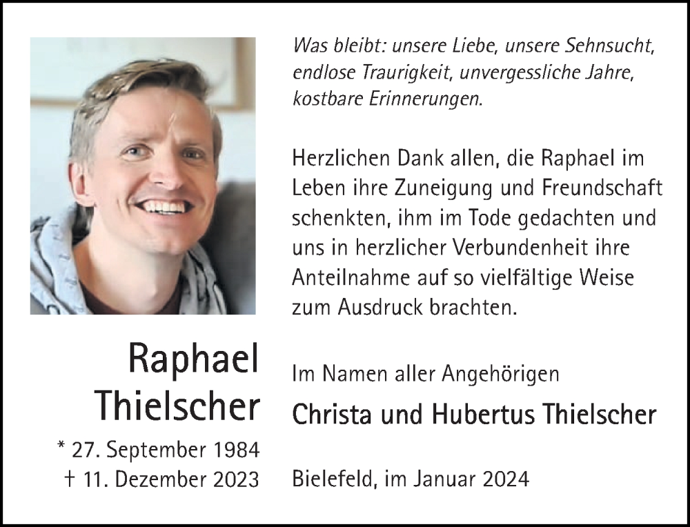 Hier finden Sie alle Traueranzeigen aus der Zeitung, die bisher für Raphael Thielscher erschienen sind. Weitere Traueranzeigen, die in der Zeitung erscheinen, werden hier ebenfalls aufgelistet