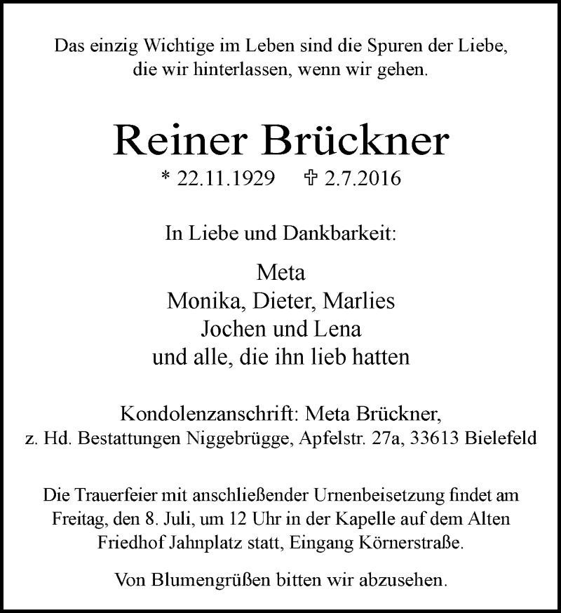 Hier finden Sie alle Traueranzeigen aus der Zeitung, die bisher für Reiner Brückner erschienen sind. Weitere Traueranzeigen, die in der Zeitung erscheinen, werden hier ebenfalls aufgelistet