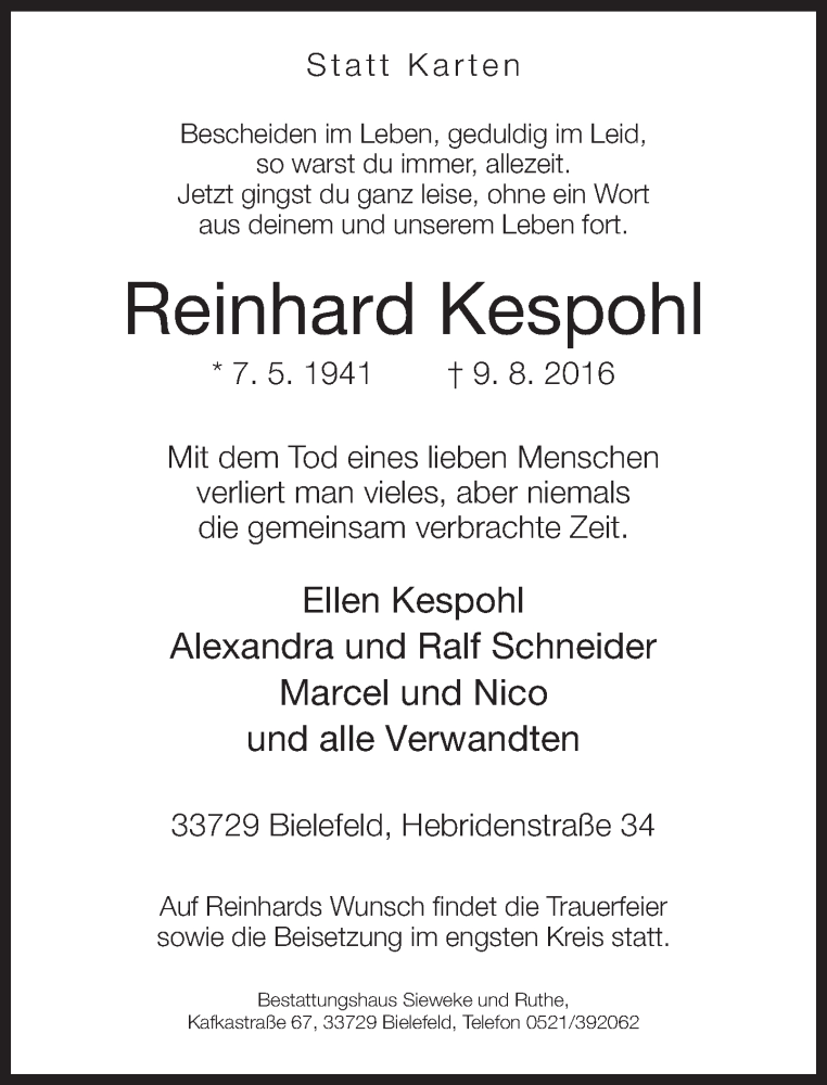 Hier finden Sie alle Traueranzeigen aus der Zeitung, die bisher für Reinhard Kespohl erschienen sind. Weitere Traueranzeigen, die in der Zeitung erscheinen, werden hier ebenfalls aufgelistet