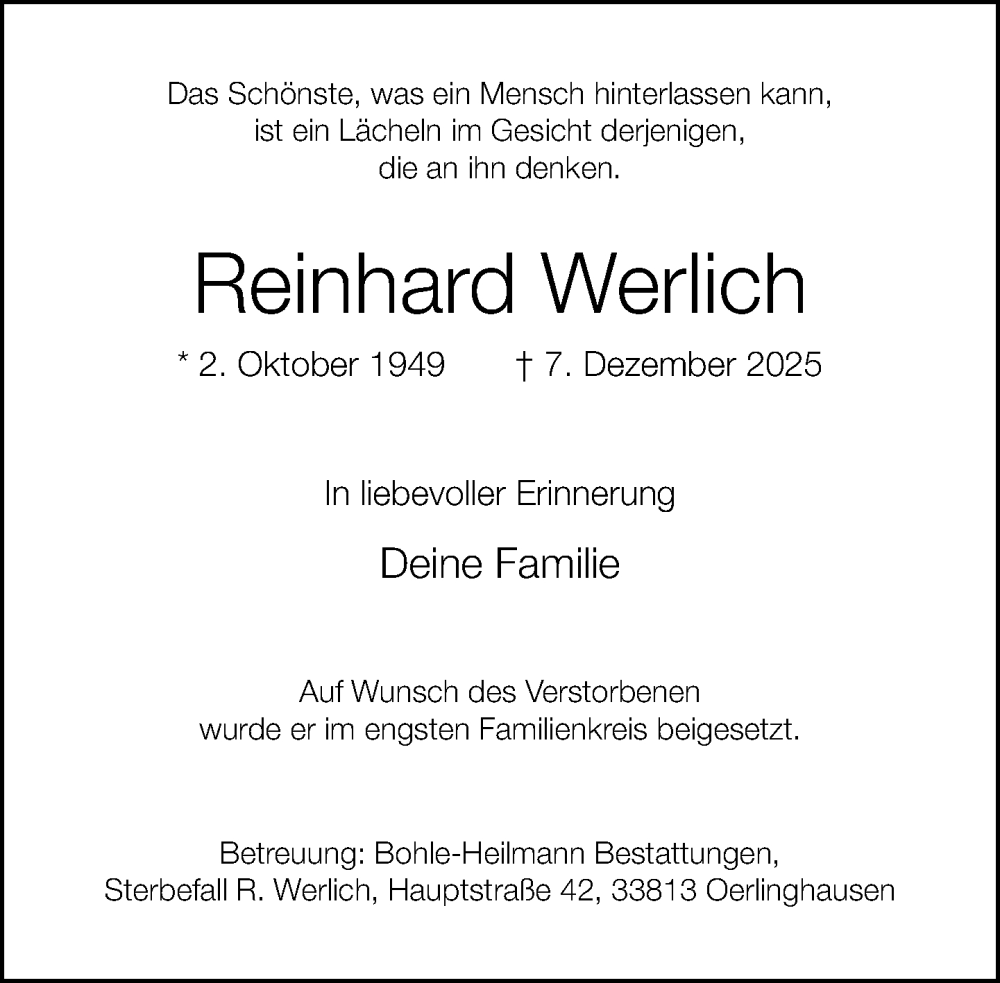 Hier finden Sie alle Traueranzeigen aus der Zeitung, die bisher für Reinhard Werlich erschienen sind. Weitere Traueranzeigen, die in der Zeitung erscheinen, werden hier ebenfalls aufgelistet