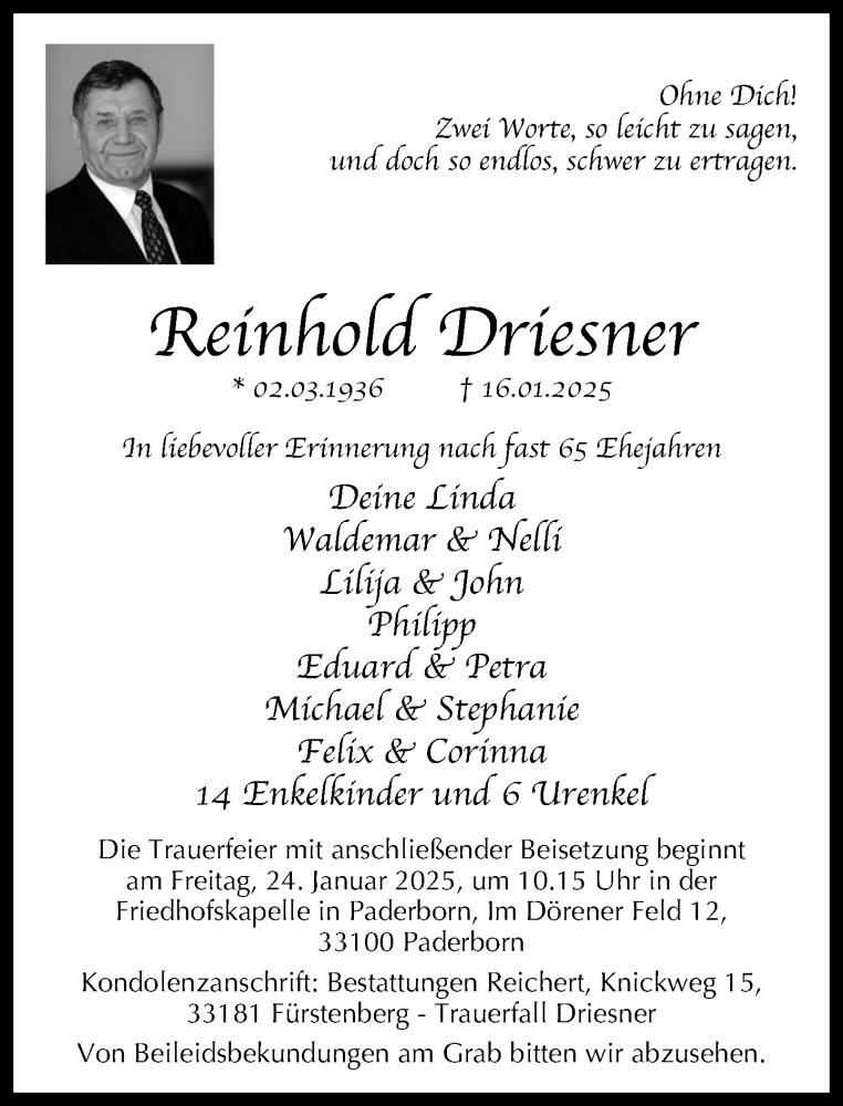 Hier finden Sie alle Traueranzeigen aus der Zeitung, die bisher für Reinhold Driesner erschienen sind. Weitere Traueranzeigen, die in der Zeitung erscheinen, werden hier ebenfalls aufgelistet