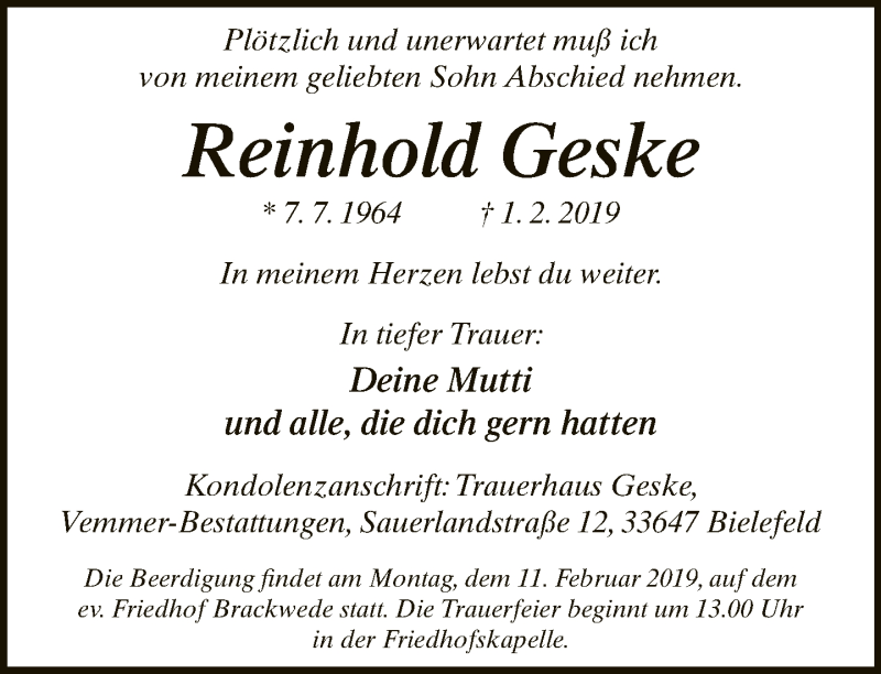 Hier finden Sie alle Traueranzeigen aus der Zeitung, die bisher für Reinhold Geske erschienen sind. Weitere Traueranzeigen, die in der Zeitung erscheinen, werden hier ebenfalls aufgelistet