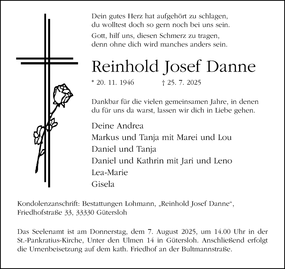 Hier finden Sie alle Traueranzeigen aus der Zeitung, die bisher für Reinhold Josef Danne erschienen sind. Weitere Traueranzeigen, die in der Zeitung erscheinen, werden hier ebenfalls aufgelistet