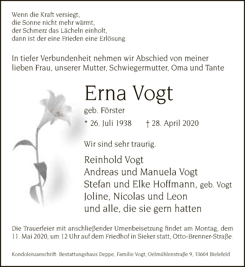 Hier finden Sie alle Traueranzeigen aus der Zeitung, die bisher für Reinhold Vogt erschienen sind. Weitere Traueranzeigen, die in der Zeitung erscheinen, werden hier ebenfalls aufgelistet
