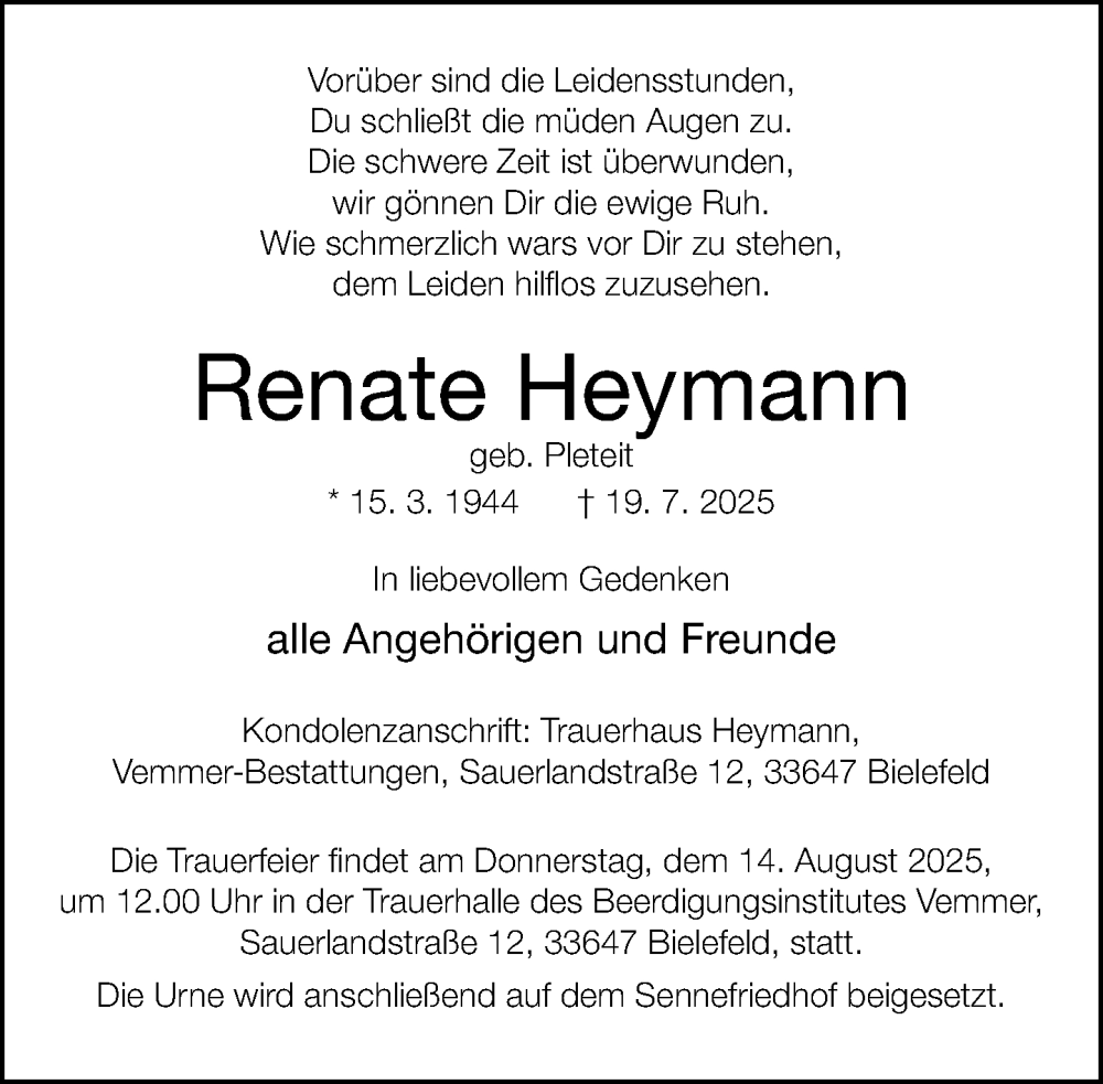 Hier finden Sie alle Traueranzeigen aus der Zeitung, die bisher für Renate Heymann erschienen sind. Weitere Traueranzeigen, die in der Zeitung erscheinen, werden hier ebenfalls aufgelistet
