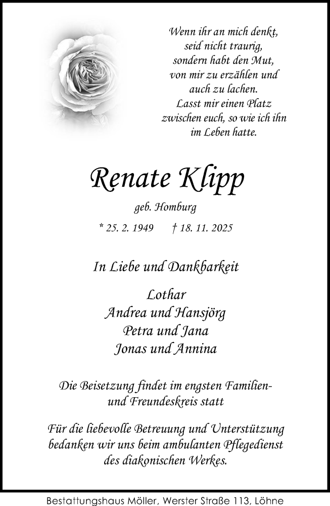 Hier finden Sie alle Traueranzeigen aus der Zeitung, die bisher für Renate Klipp erschienen sind. Weitere Traueranzeigen, die in der Zeitung erscheinen, werden hier ebenfalls aufgelistet