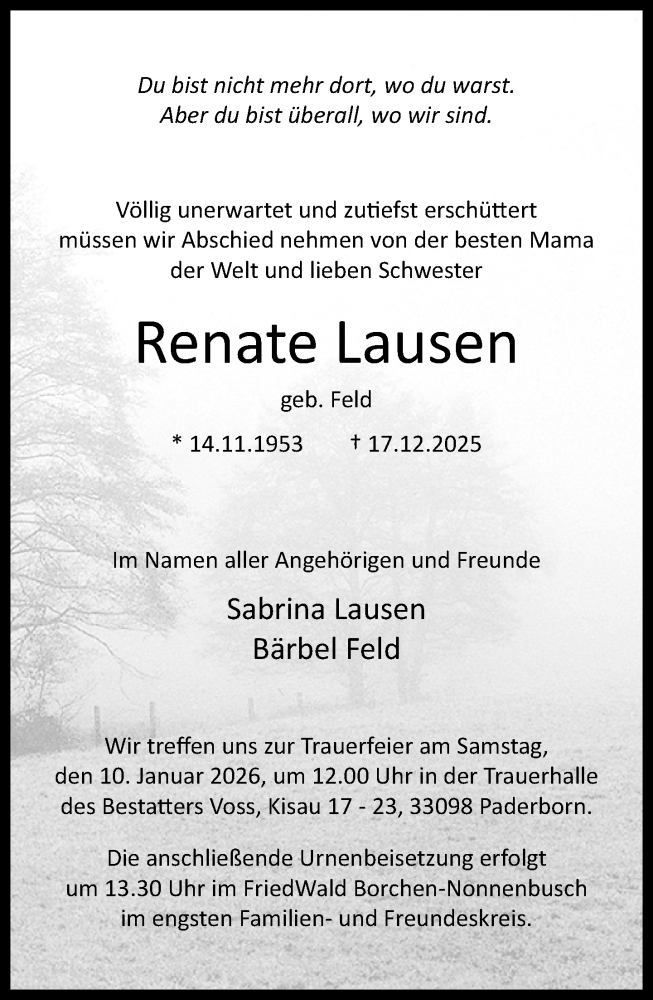 Hier finden Sie alle Traueranzeigen aus der Zeitung, die bisher für Renate Lausen erschienen sind. Weitere Traueranzeigen, die in der Zeitung erscheinen, werden hier ebenfalls aufgelistet