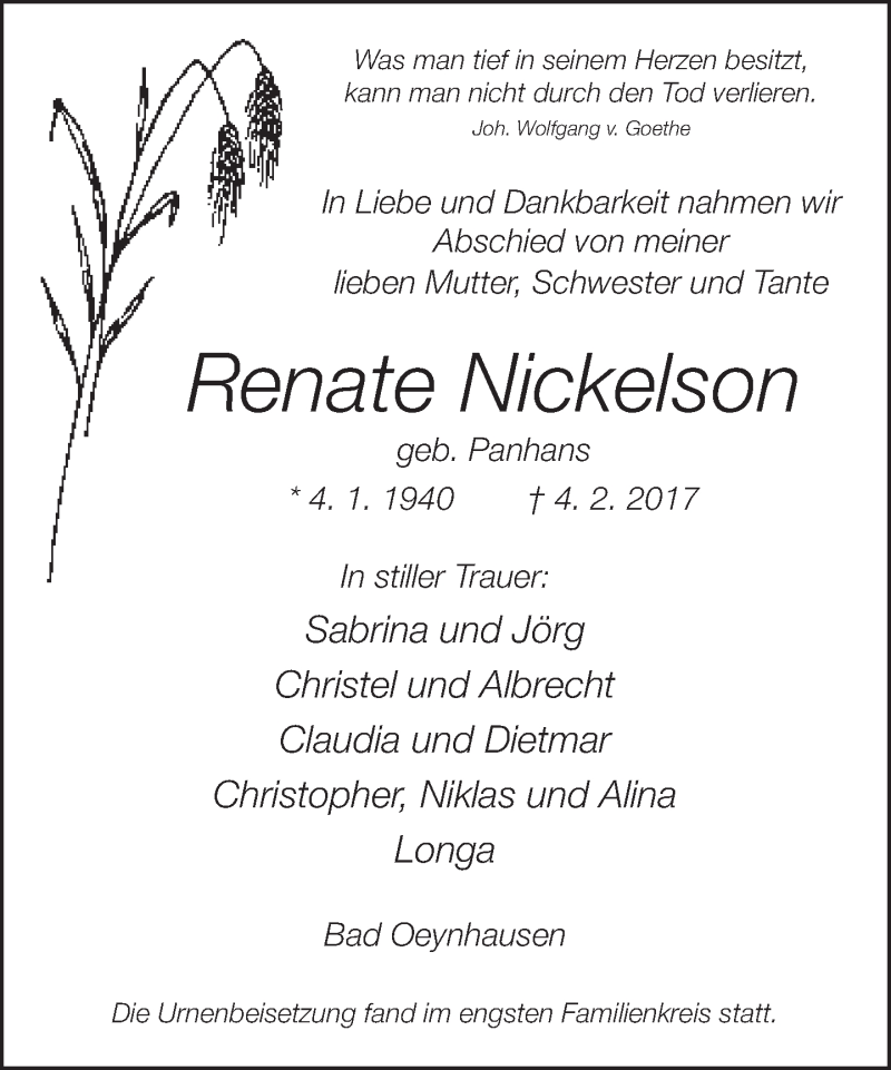 Hier finden Sie alle Traueranzeigen aus der Zeitung, die bisher für Renate Nickelson erschienen sind. Weitere Traueranzeigen, die in der Zeitung erscheinen, werden hier ebenfalls aufgelistet