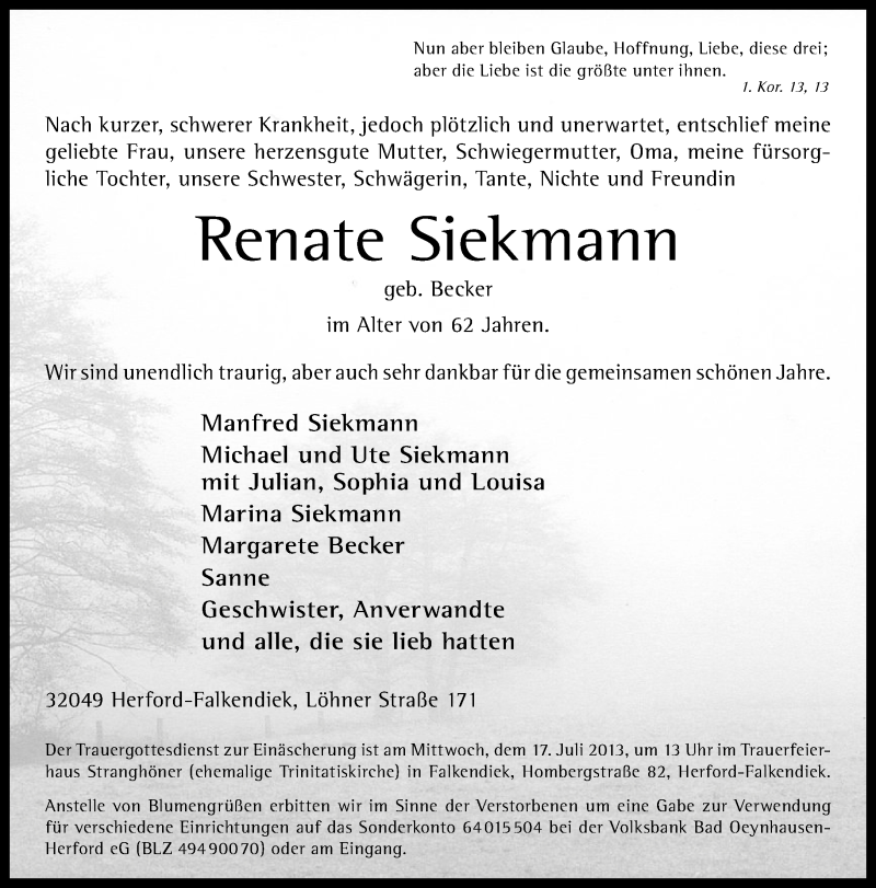 Hier finden Sie alle Traueranzeigen aus der Zeitung, die bisher für Renate Siekmann erschienen sind. Weitere Traueranzeigen, die in der Zeitung erscheinen, werden hier ebenfalls aufgelistet