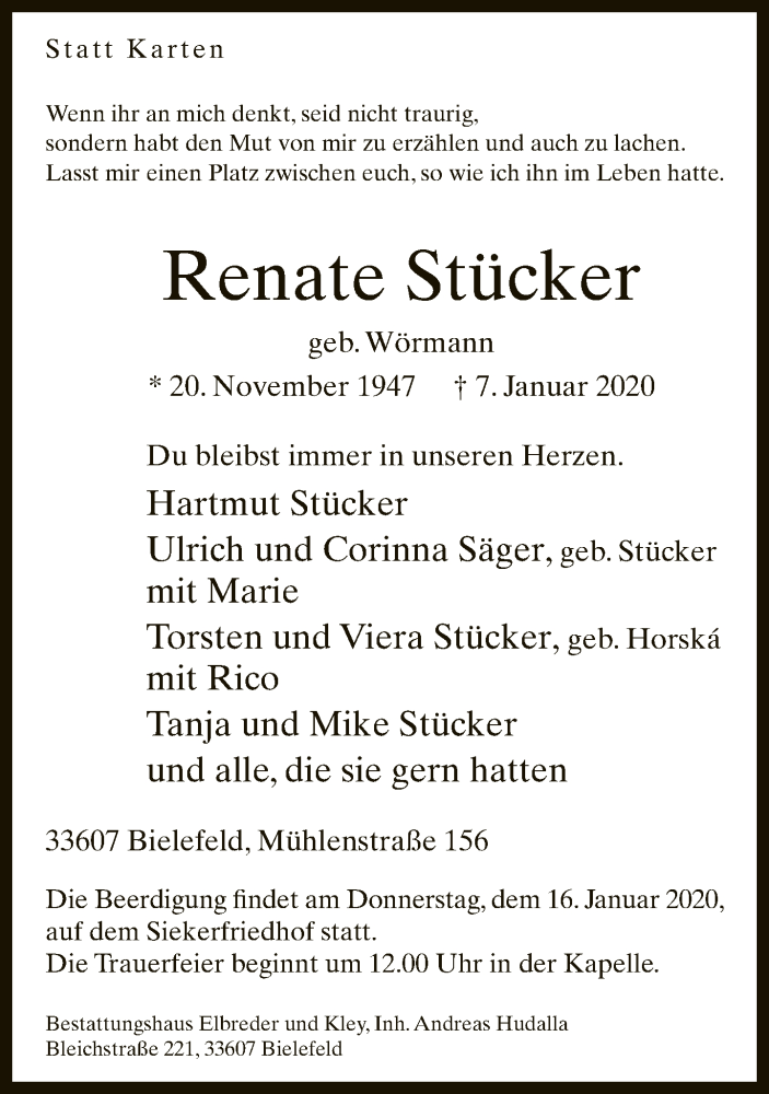 Hier finden Sie alle Traueranzeigen aus der Zeitung, die bisher für Renate Stücker erschienen sind. Weitere Traueranzeigen, die in der Zeitung erscheinen, werden hier ebenfalls aufgelistet