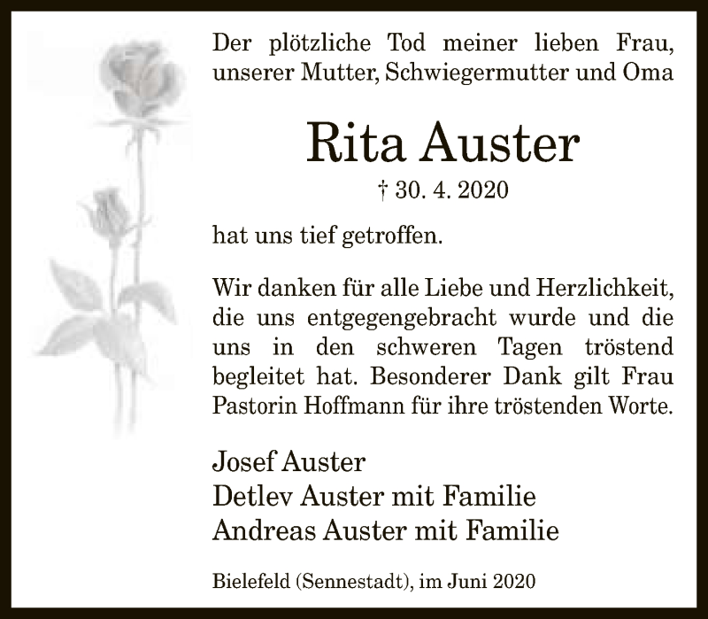 Hier finden Sie alle Traueranzeigen aus der Zeitung, die bisher für Rita Auster erschienen sind. Weitere Traueranzeigen, die in der Zeitung erscheinen, werden hier ebenfalls aufgelistet