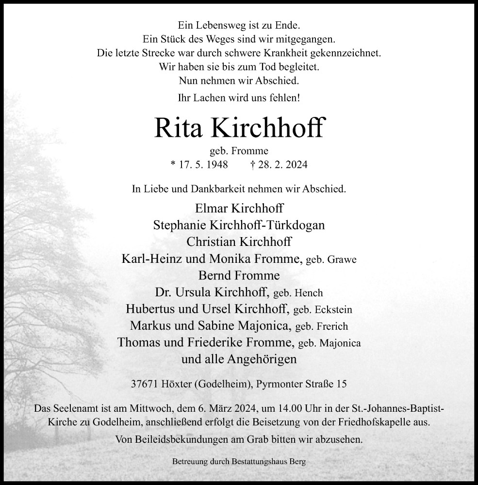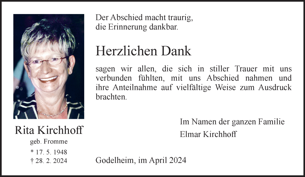 Hier finden Sie alle Traueranzeigen aus der Zeitung, die bisher für Rita Kirchhoff erschienen sind. Weitere Traueranzeigen, die in der Zeitung erscheinen, werden hier ebenfalls aufgelistet