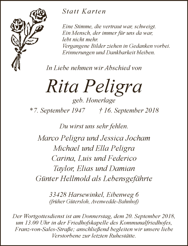 Hier finden Sie alle Traueranzeigen aus der Zeitung, die bisher für Rita Peligra erschienen sind. Weitere Traueranzeigen, die in der Zeitung erscheinen, werden hier ebenfalls aufgelistet