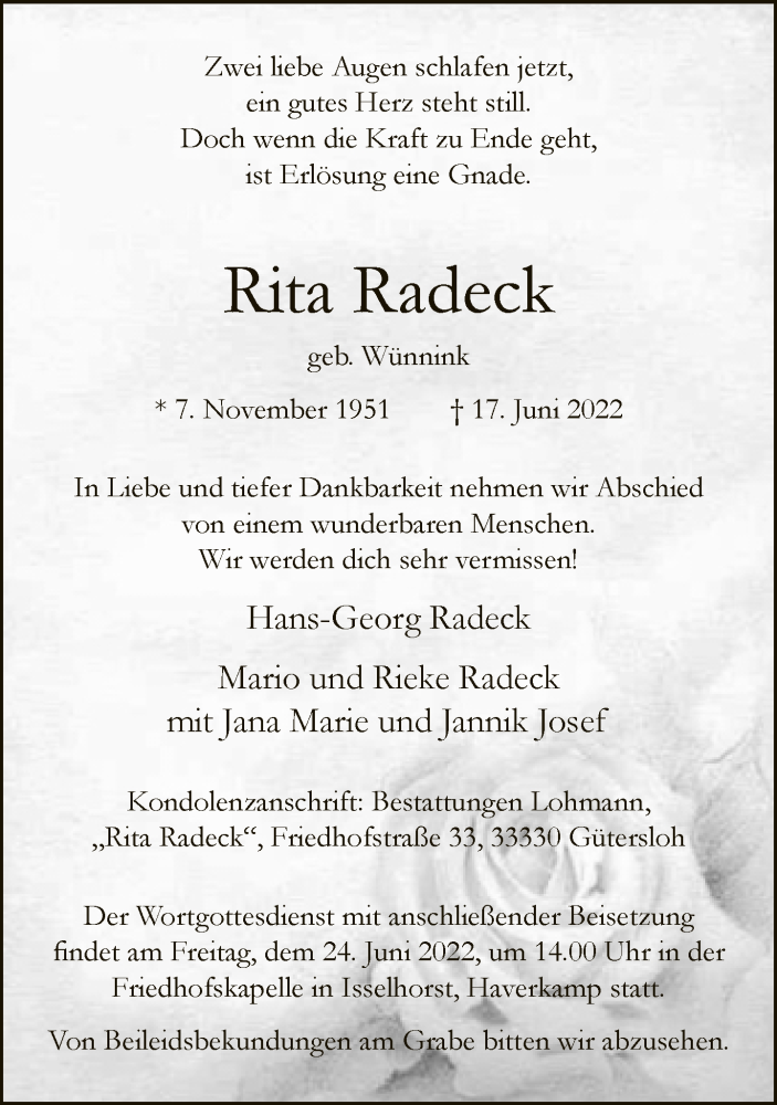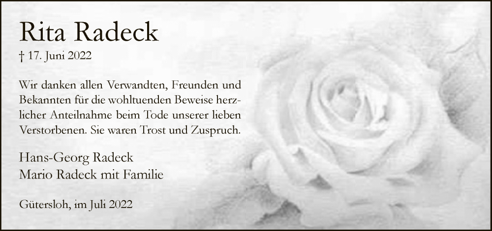 Hier finden Sie alle Traueranzeigen aus der Zeitung, die bisher für Rita Radeck erschienen sind. Weitere Traueranzeigen, die in der Zeitung erscheinen, werden hier ebenfalls aufgelistet