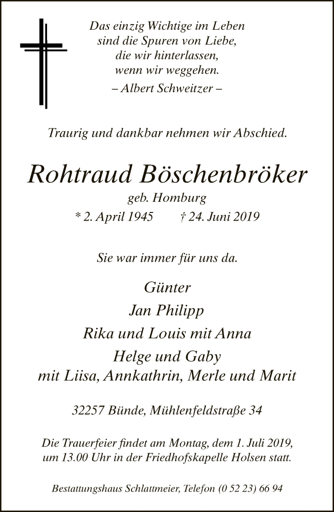 Hier finden Sie alle Traueranzeigen aus der Zeitung, die bisher für Rohtraud Böschenbröker erschienen sind. Weitere Traueranzeigen, die in der Zeitung erscheinen, werden hier ebenfalls aufgelistet