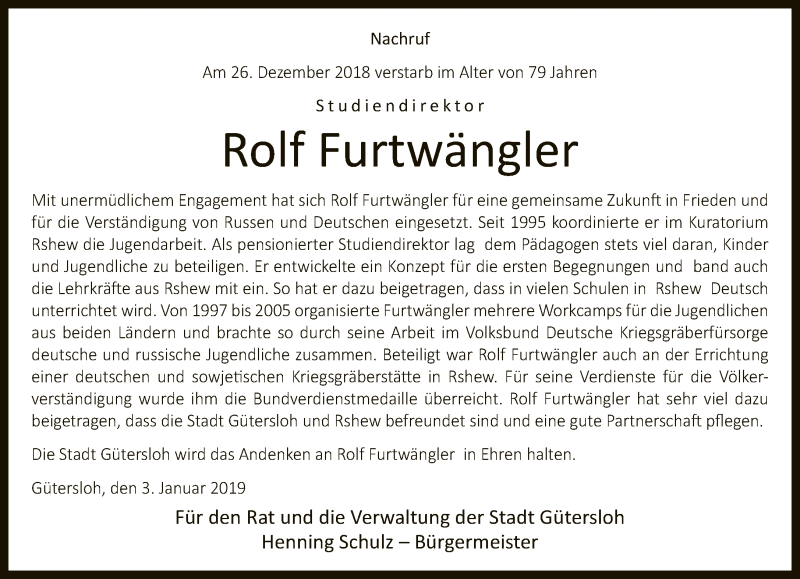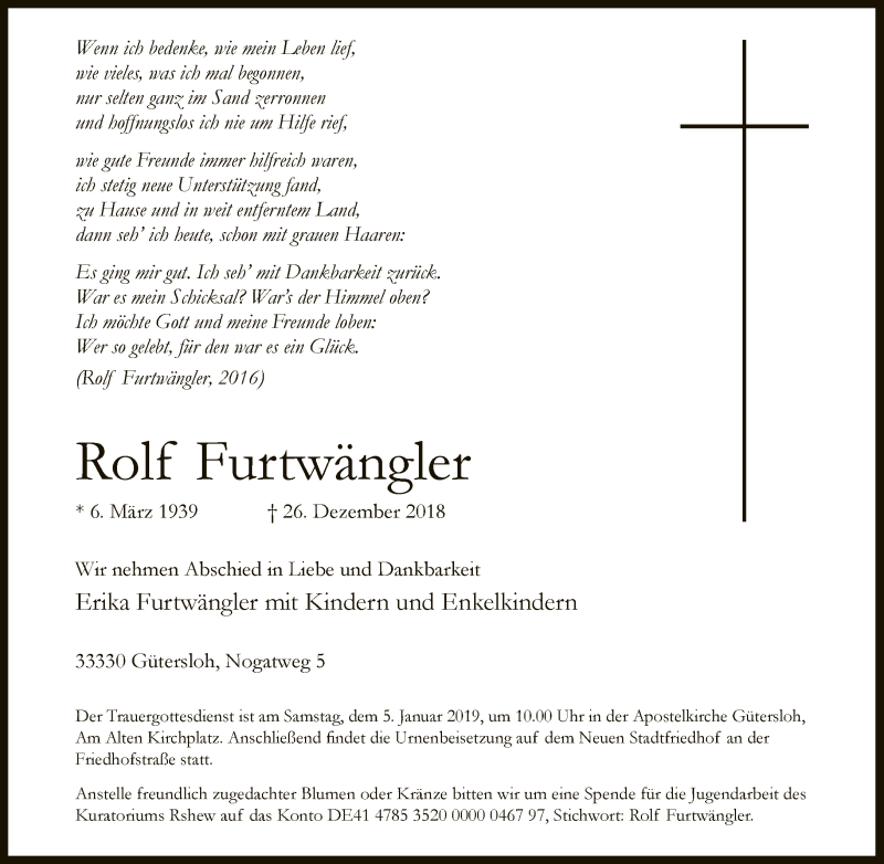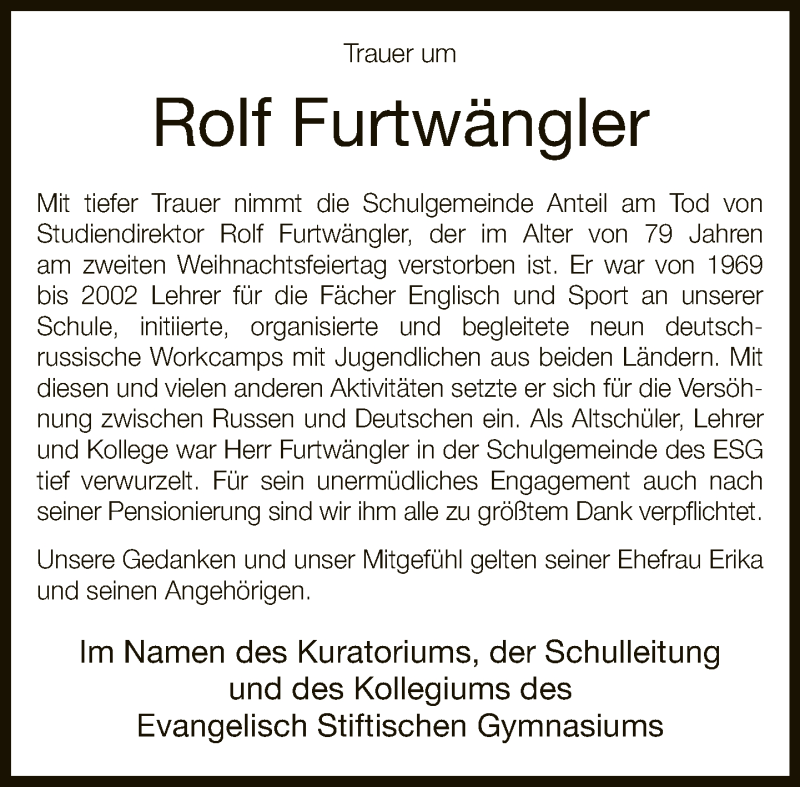 Hier finden Sie alle Traueranzeigen aus der Zeitung, die bisher für Rolf Furtwängler erschienen sind. Weitere Traueranzeigen, die in der Zeitung erscheinen, werden hier ebenfalls aufgelistet