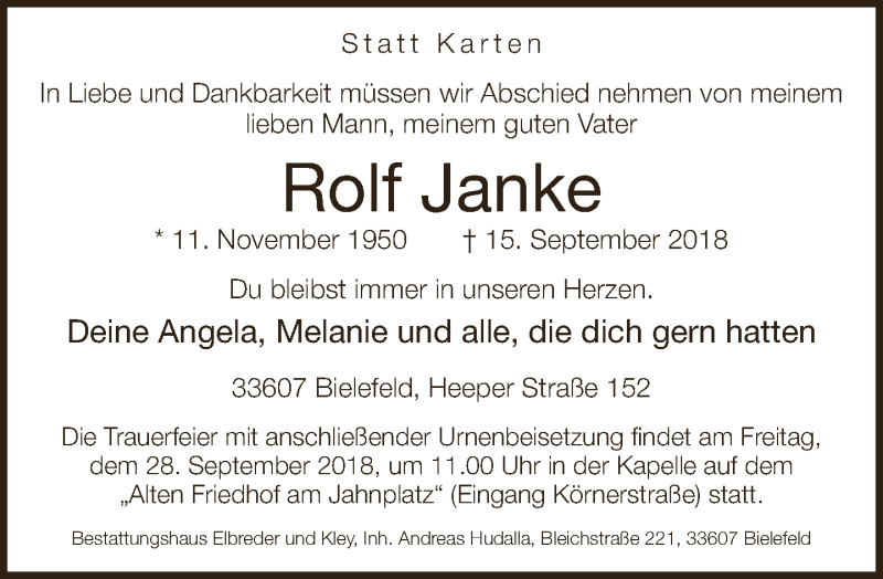 Hier finden Sie alle Traueranzeigen aus der Zeitung, die bisher für Rolf Janke erschienen sind. Weitere Traueranzeigen, die in der Zeitung erscheinen, werden hier ebenfalls aufgelistet
