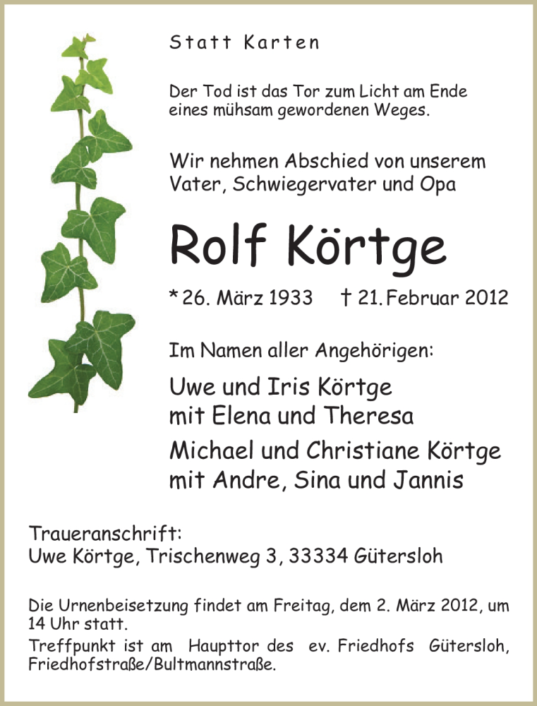 Hier finden Sie alle Traueranzeigen aus der Zeitung, die bisher für Rolf Körtge erschienen sind. Weitere Traueranzeigen, die in der Zeitung erscheinen, werden hier ebenfalls aufgelistet