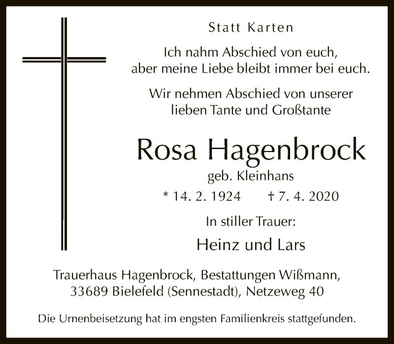 Hier finden Sie alle Traueranzeigen aus der Zeitung, die bisher für Rosa Hagenbrock erschienen sind. Weitere Traueranzeigen, die in der Zeitung erscheinen, werden hier ebenfalls aufgelistet