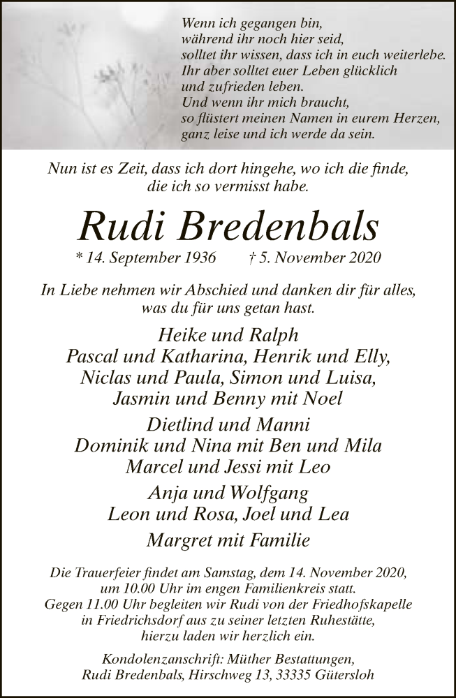Hier finden Sie alle Traueranzeigen aus der Zeitung, die bisher für Rudi Bredenbals erschienen sind. Weitere Traueranzeigen, die in der Zeitung erscheinen, werden hier ebenfalls aufgelistet