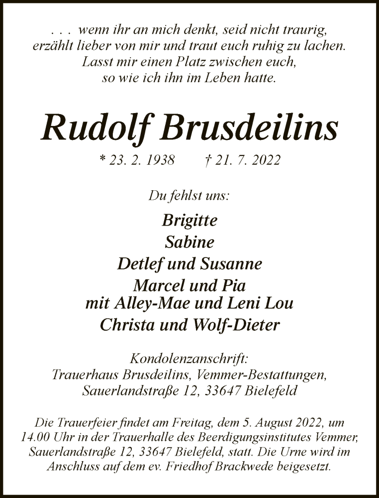 Hier finden Sie alle Traueranzeigen aus der Zeitung, die bisher für Rudolf Brusdeilins erschienen sind. Weitere Traueranzeigen, die in der Zeitung erscheinen, werden hier ebenfalls aufgelistet