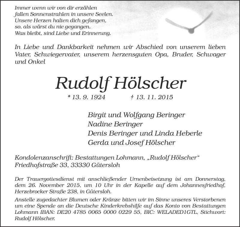 Hier finden Sie alle Traueranzeigen aus der Zeitung, die bisher für Rudolf Hölscher erschienen sind. Weitere Traueranzeigen, die in der Zeitung erscheinen, werden hier ebenfalls aufgelistet