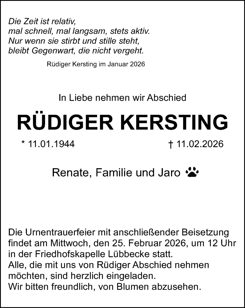 Hier finden Sie alle Traueranzeigen aus der Zeitung, die bisher für Rüdiger Kersting erschienen sind. Weitere Traueranzeigen, die in der Zeitung erscheinen, werden hier ebenfalls aufgelistet