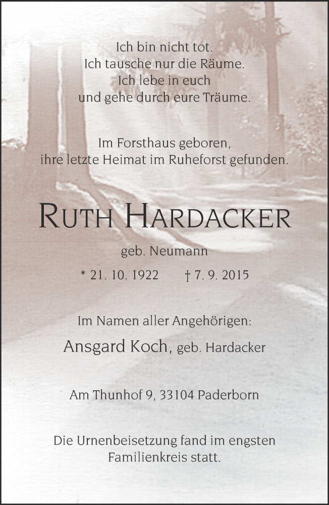 Hier finden Sie alle Traueranzeigen aus der Zeitung, die bisher für Ruth Hardacker erschienen sind. Weitere Traueranzeigen, die in der Zeitung erscheinen, werden hier ebenfalls aufgelistet