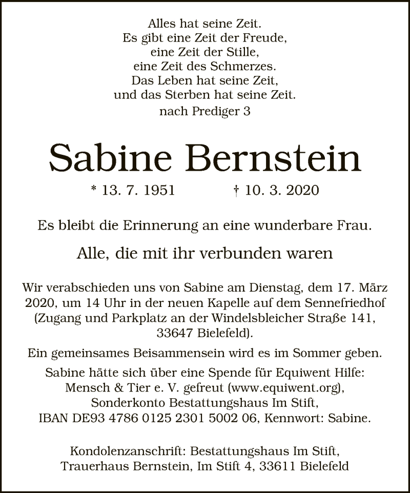 Hier finden Sie alle Traueranzeigen aus der Zeitung, die bisher für Sabine Bernstein erschienen sind. Weitere Traueranzeigen, die in der Zeitung erscheinen, werden hier ebenfalls aufgelistet