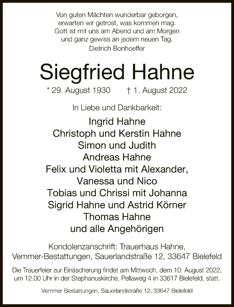 Hier finden Sie alle Traueranzeigen aus der Zeitung, die bisher für Siegfried Hahne erschienen sind. Weitere Traueranzeigen, die in der Zeitung erscheinen, werden hier ebenfalls aufgelistet