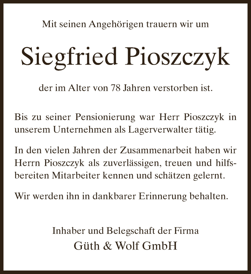 Hier finden Sie alle Traueranzeigen aus der Zeitung, die bisher für Siegfried Pioszczyk erschienen sind. Weitere Traueranzeigen, die in der Zeitung erscheinen, werden hier ebenfalls aufgelistet