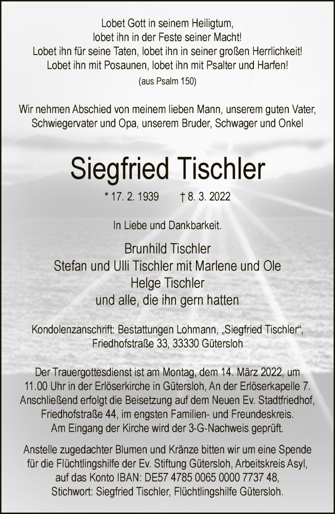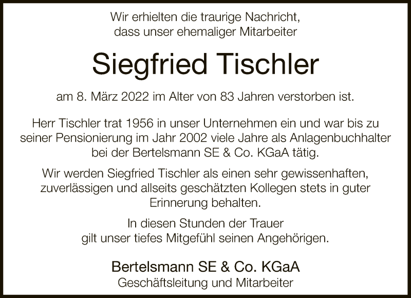 Hier finden Sie alle Traueranzeigen aus der Zeitung, die bisher für Siegfried Tischler erschienen sind. Weitere Traueranzeigen, die in der Zeitung erscheinen, werden hier ebenfalls aufgelistet