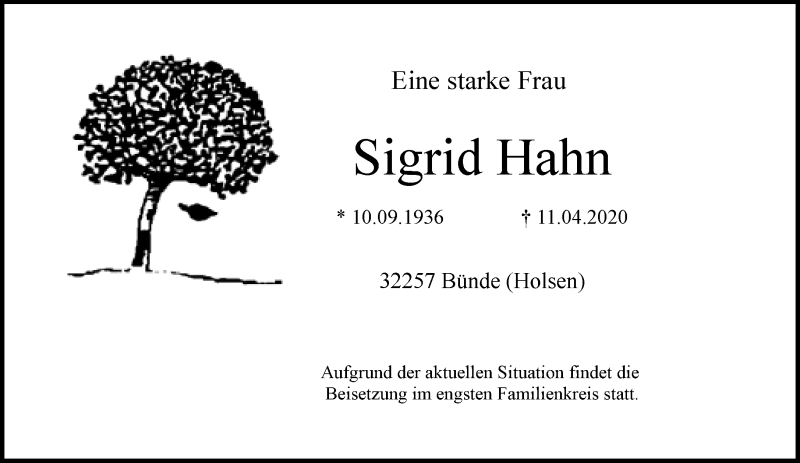 Hier finden Sie alle Traueranzeigen aus der Zeitung, die bisher für Sigrid Hahn erschienen sind. Weitere Traueranzeigen, die in der Zeitung erscheinen, werden hier ebenfalls aufgelistet
