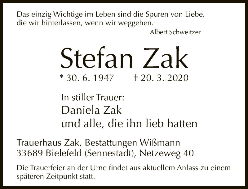 Hier finden Sie alle Traueranzeigen aus der Zeitung, die bisher für Stefan Zak erschienen sind. Weitere Traueranzeigen, die in der Zeitung erscheinen, werden hier ebenfalls aufgelistet