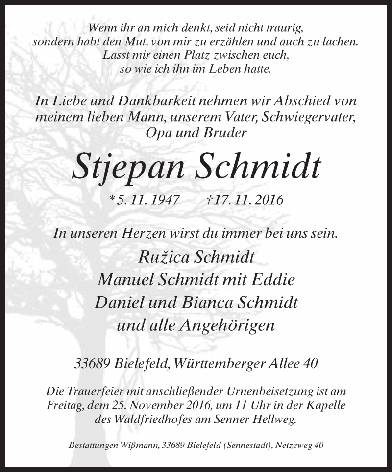 Hier finden Sie alle Traueranzeigen aus der Zeitung, die bisher für Stjepan Schmidt erschienen sind. Weitere Traueranzeigen, die in der Zeitung erscheinen, werden hier ebenfalls aufgelistet