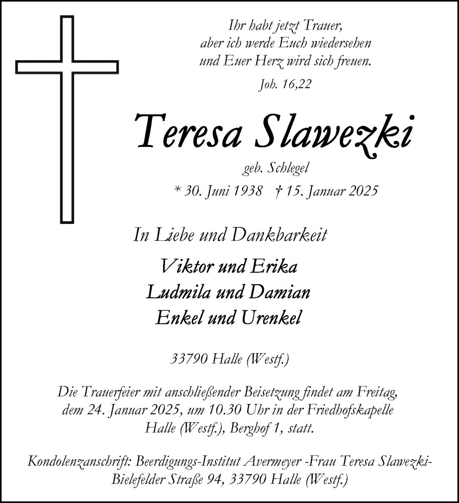 Hier finden Sie alle Traueranzeigen aus der Zeitung, die bisher für Teresa Slawezki erschienen sind. Weitere Traueranzeigen, die in der Zeitung erscheinen, werden hier ebenfalls aufgelistet